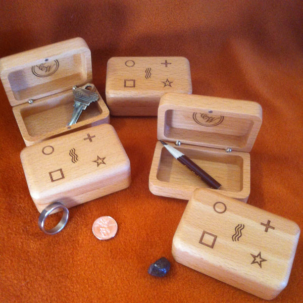 You receive 5 beautifully executed wooden boxes engraved with ESP symbols. Each box contains an interesting item; a key, a ring, a small pencil, a stone and a penny.
