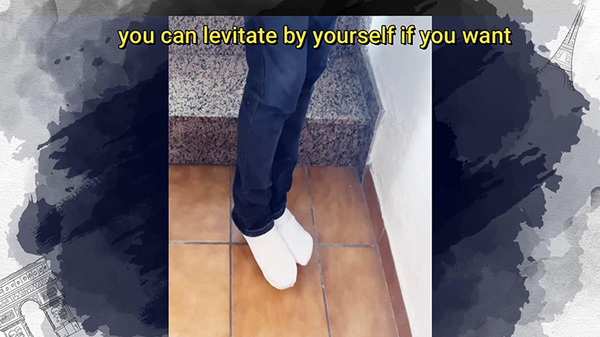 Tell a spectator to extend their arms and with their hands out in front of them they grab the yours. In a few seconds you begin to levitate, once in the air, slowly descend and show your feet underneath and all around showing that there is nothing under your feet. You can spin in the air!