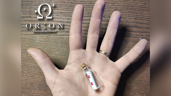A message is chosen in the form of a playing card. You introduce a mini glass bottle sealed with a cork. With a wave of the hand a miniature of the selection appears rolled up and sealed inside the bottle. You open up the bottle to toss it out and as it emerges from within it's glass prison it enlarges to the actual size of the selection.