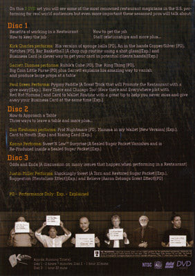 On this 3 DVD set you will see some of the most renowned restaurant magicians in the U.S. performing for real audiences but even more important these seasoned pros will talk about: