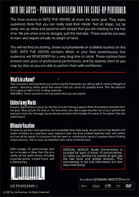"I just finished watching Into The Abyss. It is great! VERY direct, usable, and non procedural mentalism. What's In a Name in particular is superb and "worth the price of the DVD"... if you do this they have to believe you truly can read their mind."