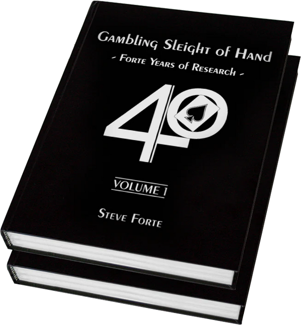 "Gambling Sleight of Hand - Forte Years of Research" is a two-volume set consisting of over 1,100 pages and 1,300 black/white photographs. The set details over 1,000 combined gambling moves, stunts, technical considerations, principles, and key observations. The research was specifically culled and written for the ‘hobbyist,’ e.g., magicians, cardmen, and cardwomen.